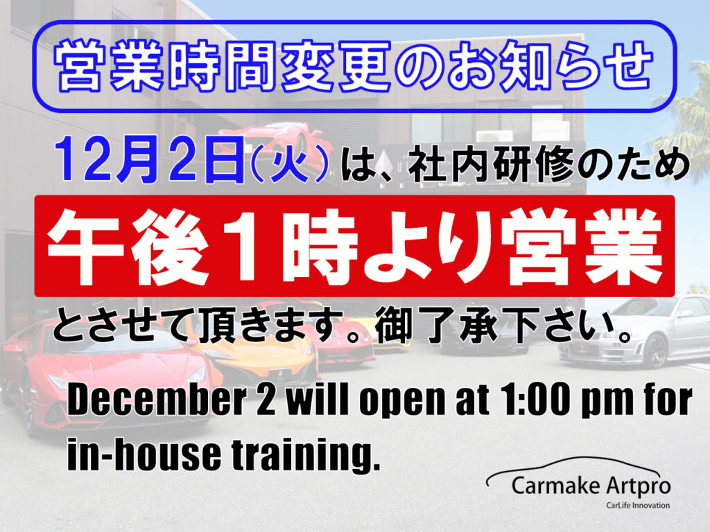 いつもご来店頂きまして誠にありがとうございます。 誠に勝手ながら、12月2日(火)は社内研修のため、午後1時からの営業とさせて頂きます。 12月3日(水)からは、通常通り午前9時半からの営業とさせて頂きます。