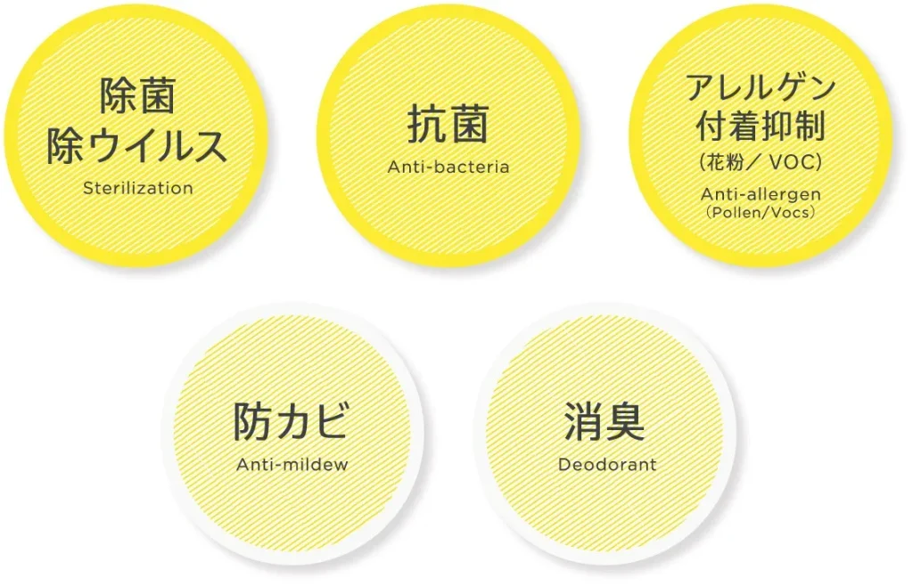 アレルゲン付着抑制(Anti-allergen) 花粉やVOC(揮発性有機化合物)などのアレルゲン物質が付着しにくくなり、快適な空間づくりに役立ちます。