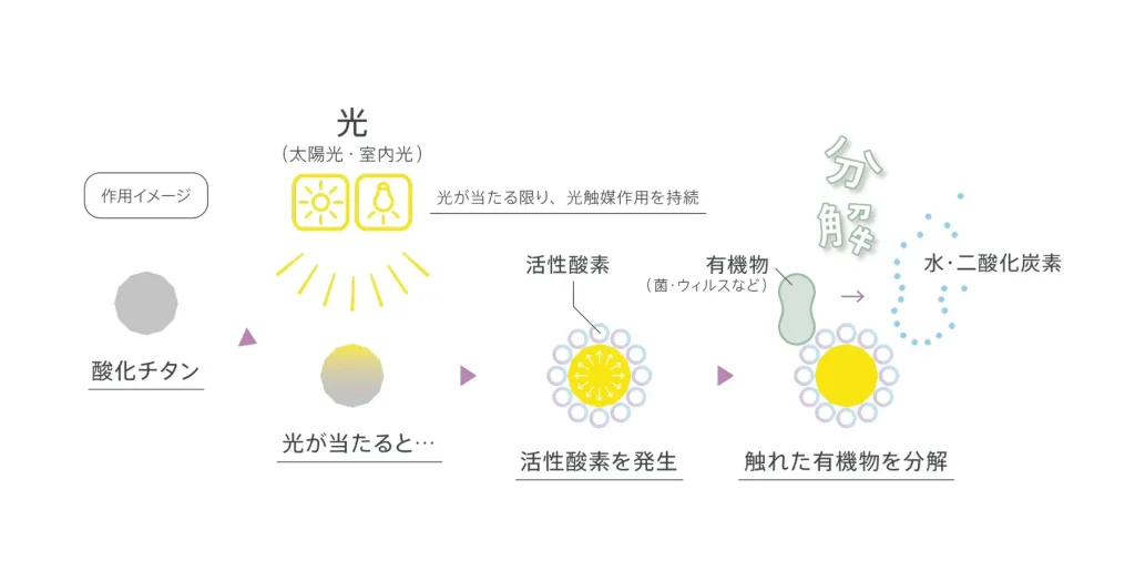 酸化チタンは、太陽光や室内光などの“光”が当たることで反応を起こす物質です。光が照射されている間は、その働きが継続します。 酸化チタンに光が当たると、表面で活性酸素が発生します。この活性酸素には強い分解作用があり、空気中や表面に付着している菌・ウイルス・汚れなどの有機物を分解します。最終的には、それらの有機物は水や二酸化炭素などの無害な成分へと変化します。 つまり、光と酸化チタンを利用することで、継続的に抗菌・消臭・防汚といった効果を発揮できる仕組みを示した図となっています。