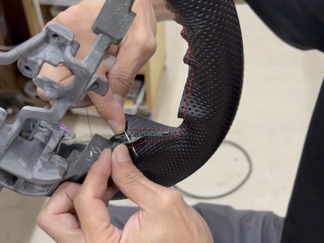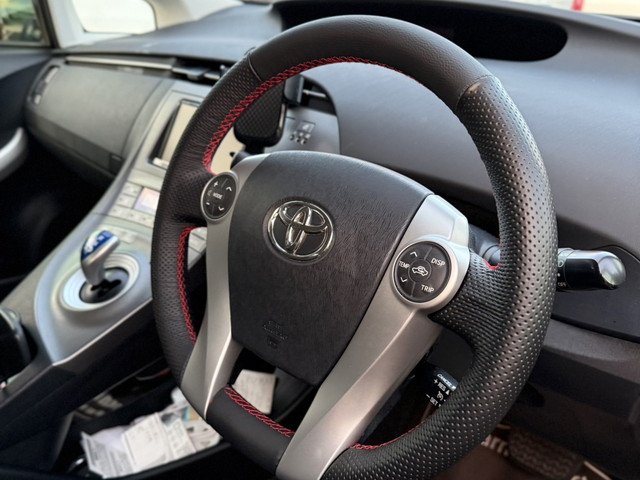 今回はプリウス30系のステアリング巻き替えをご依頼いただきました。 純正のブラック・ノーマルレザーから、 ディンプルレザーとノーマルレザーのコンビ仕様へ変更し、 ステッチは赤色で仕上げています。