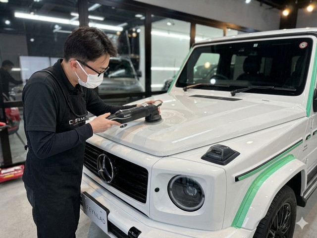 無骨さとラグジュアリー性を兼ね備えたGクラスに、 最上級の美観と保護性能を与えるため、 2層セラミックコーティングを施工させていただきました。
