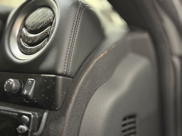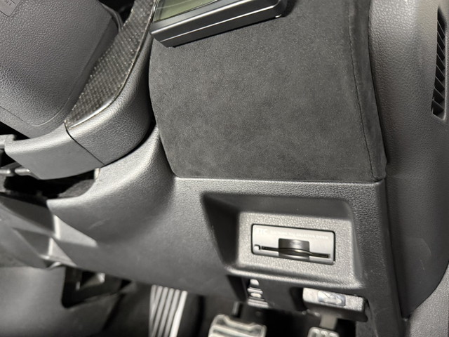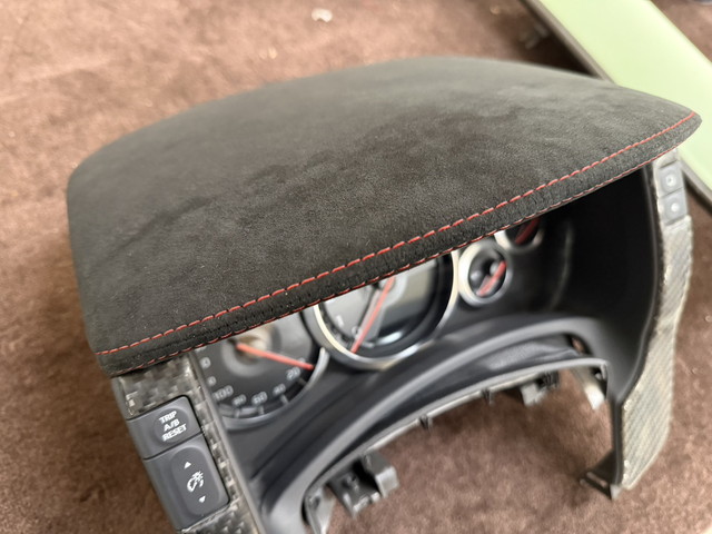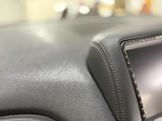 張り替え後は、内装の印象が一変。 • ダッシュボード割れの不安を根本解消 • アルカンターラ特有のマットで上質な質感 • 赤ダブルステッチが映えるスポーティな仕上がり