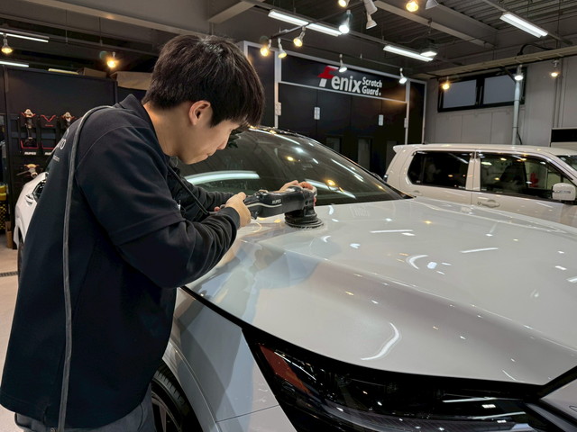 スクラッチ傷等が残ってしまうとコーティングがしっかり定着しなくなってしまうのでとても大切な工程となるのです。 LEDライトを使いながら磨き上げていきます。