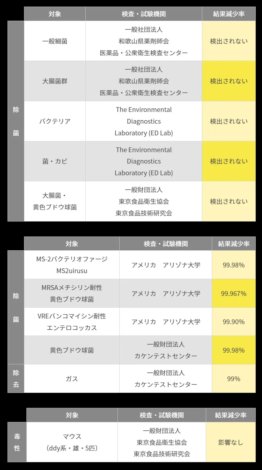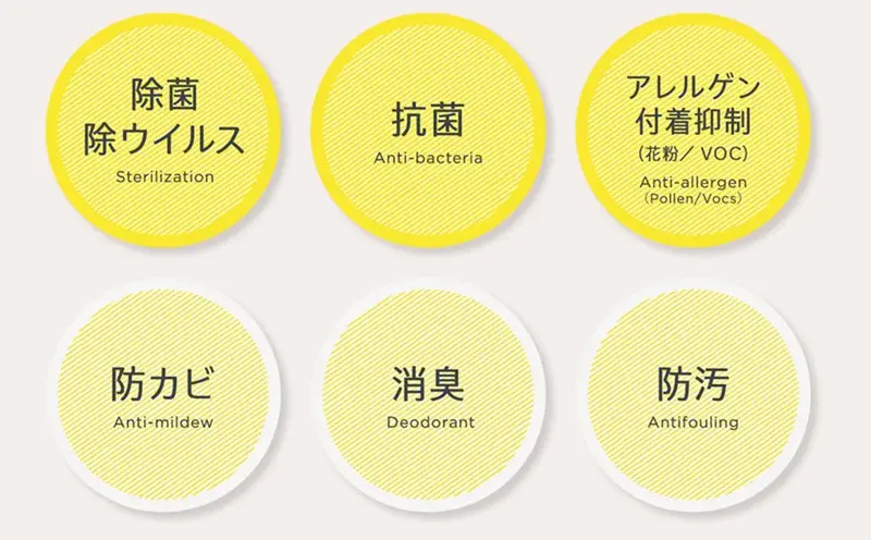 消臭・抗菌・抗ウイルス・抗カビ・揮発性有機化合物除去・紫外線防御。 抗菌効果試験で絶大な効果が認められました。