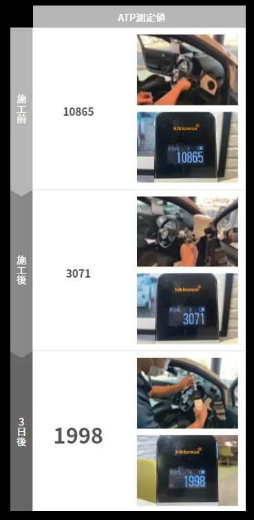 ※キッコーマン(株)ルミテスターを使用し、ATO測定法(ATP拭き取り検査)を実施。 ※ATPとはミトコンドリアが作り出すエネルギーの値、ATPが存在=生物が存在する証拠と言えます。 ※ATPは直ぐには減らず、時間が経つにつれて減っていきます。但し、施工面に菌が付着する度にATPが検出される為、0になることはありません。