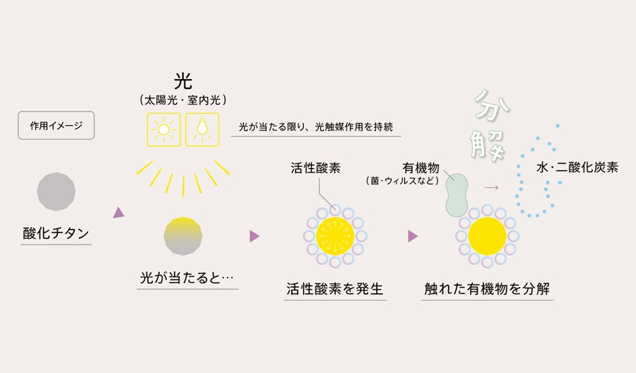 1967年、東京大学の研究で発見。酸化チタンに光が当たると、空気中の酸素や水分に反応し、活性酸素または活性水酸基を発生します。それらが接触する有機物(菌・ウイルス・VOC・臭い等)を酸化分解あるいは不活化させる作用です。